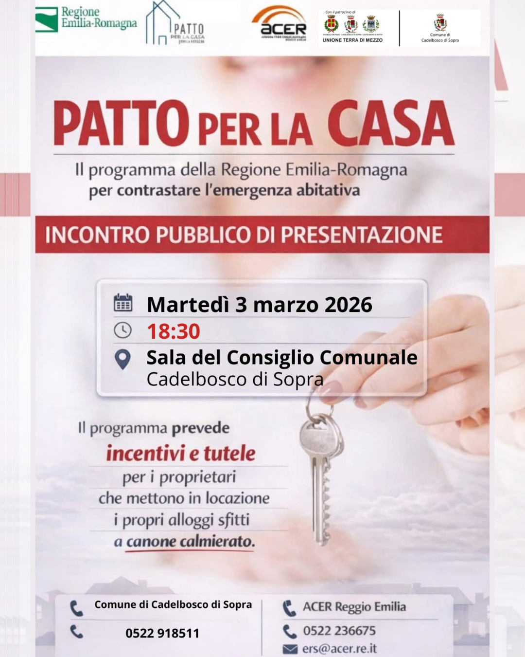 Il Comune di Cadelbosco di Sopra e l’Unione Terra di Mezzo organizzano un incontro aperto alla cittadinanza per presentare il nuovo programma regionale Patto per la Casa, un’opportunità concreta rivolta ai proprietari di immobili sfitti e ai cittadini interessati a soluzioni abitative a canone calmierato.